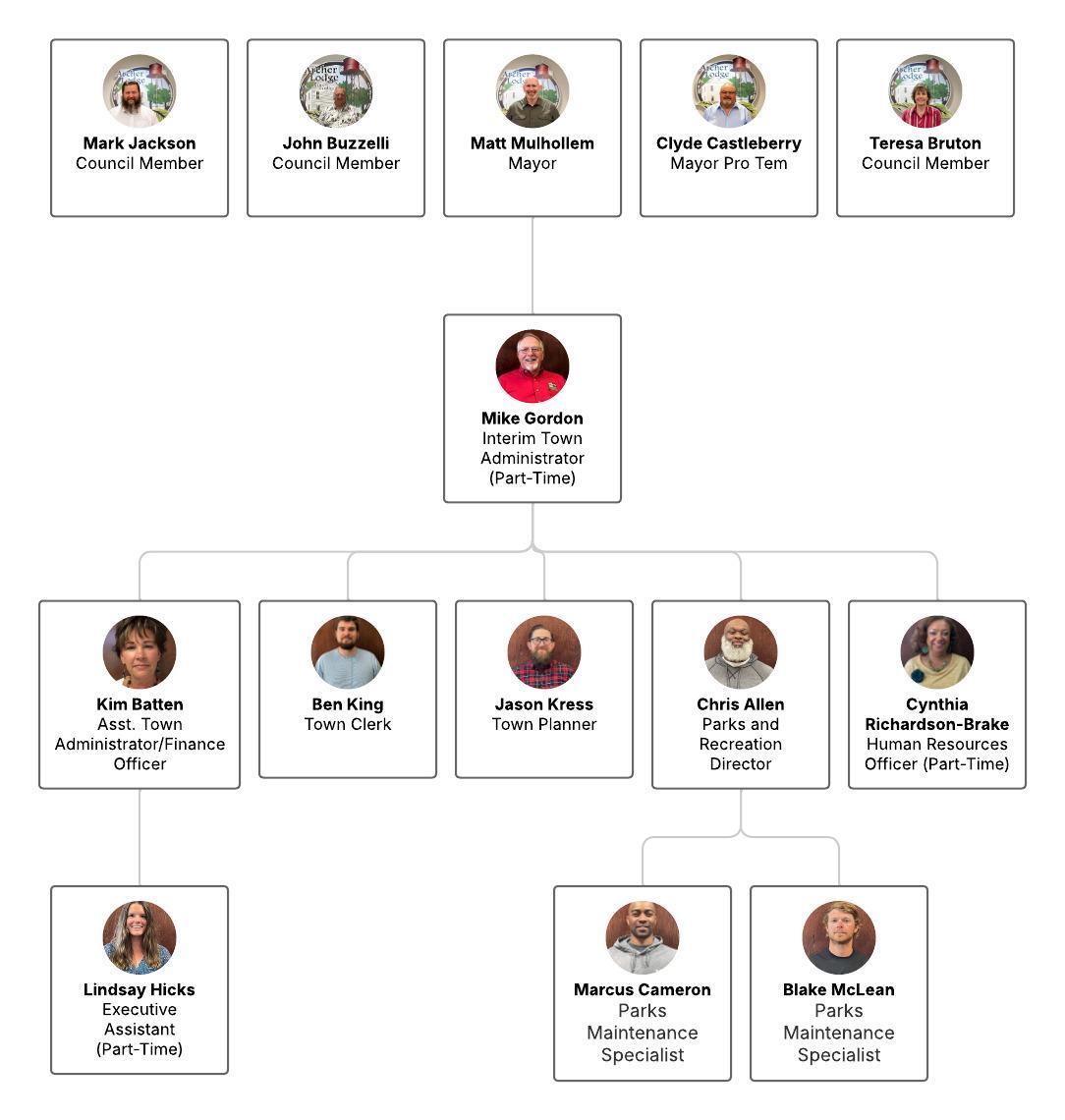 The Town of Archer Lodge operates under the Mayor-Council form of government. Under the Mayor-Council form of government the Town Administrator works with staff to achieve goals and policies set forth by the Council. This means that the Council has oversight over the Administrator, and the Administrator takes care of the day-to-day operations of the Town.