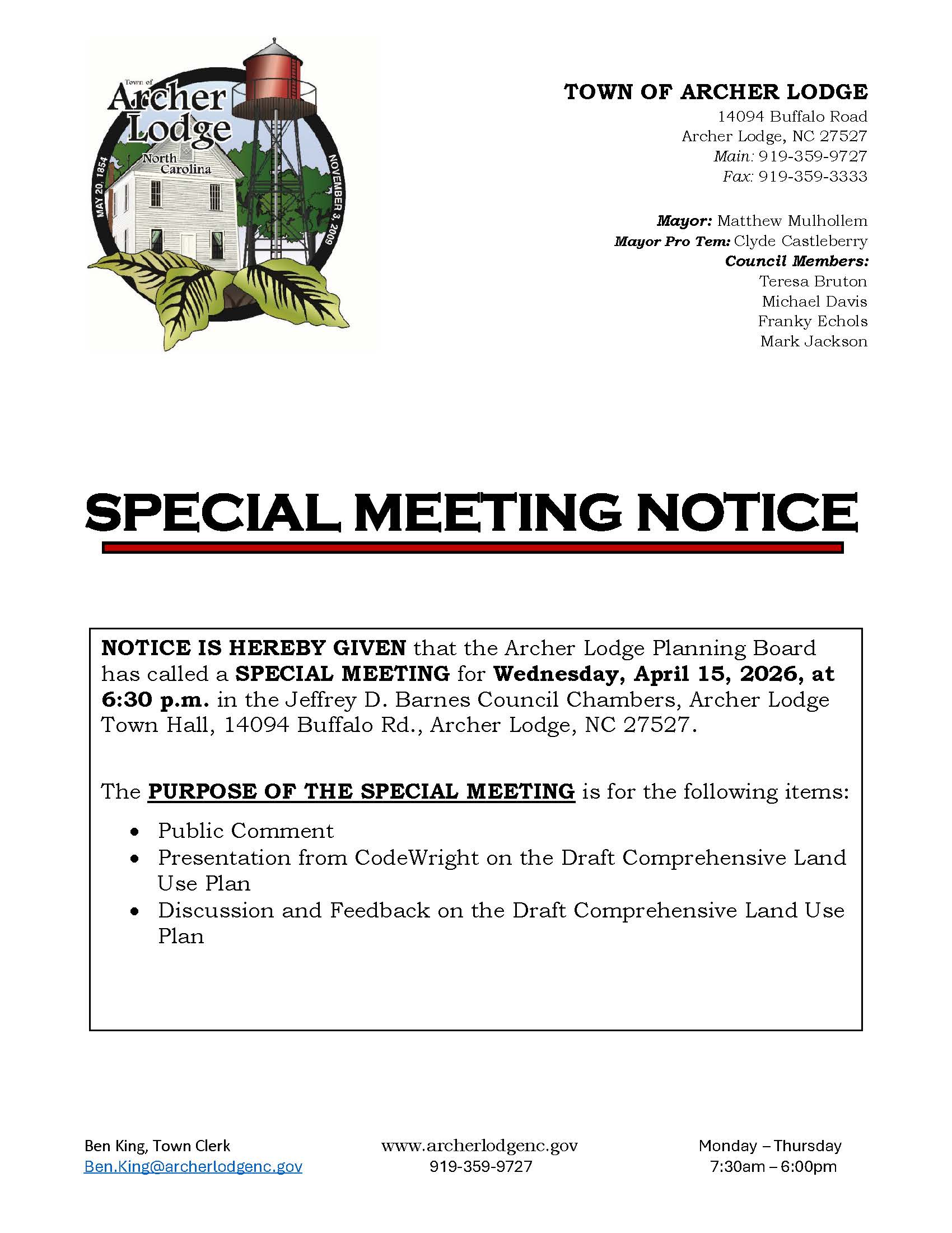 NOTICE IS HEREBY GIVEN that the Archer Lodge Planning Board